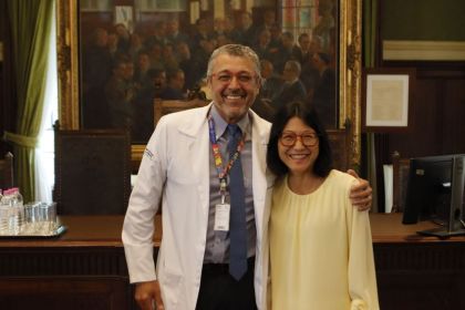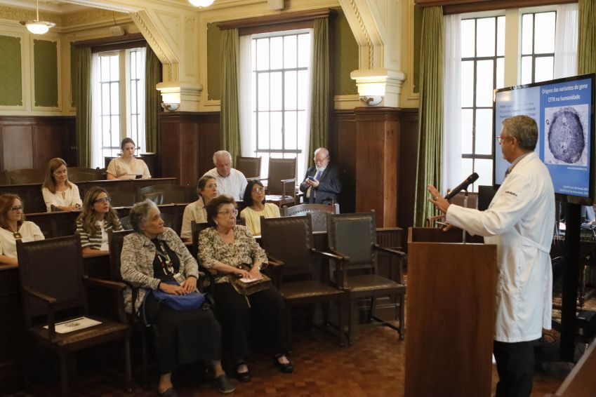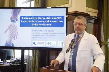 Participaram da mesa solene do evento realizado na Sala da Congregação da FMUSP: a Profª. Drª. Magda Carneiro-Sampaio, Professora Sênior do Departamento de Pediatria da FMUSP; Profª. Drª. Ester Cerdeira Sabino, Titular do Departamento de Patologia da FMUSP e a Profª. Drª. Patrícia Coelho de Soárez, Professora Associada do Departamento de Medicina Preventiva da FMUSP. O primeiro tema – “Tratamento da Fibrose Cística no SUS: A importância do acompanhamento dos dados de vida real” - foi apresentado pelo Prof. Dr. Luiz Vicente Ribeiro Ferreira da Silva Filho, Professor Associado do Departamento de Pediatria da FMUSP.
