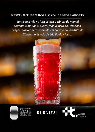 ● Parceria com o restaurante Rubaiyat: neste Outubro Rosa, o Rubaiyat se une ao Icesp para celebrar a força e a beleza das mulheres. Durante todo o mês, o lucro das vendas da Limonada Ginger Blossom, drink não-alcoólico, será revertido em doação ao Instituto;